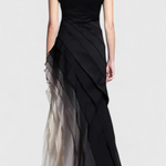 Sofisticación ligera con un juego de tonos que capturan todas las miradas. El vestido Angela combina un elegante escote barco sin mangas con capas de gasa que fluyen con naturalidad. Su degradado de negro a marfil aporta profundidad visual y una presencia refinada para ocasiones especiales.